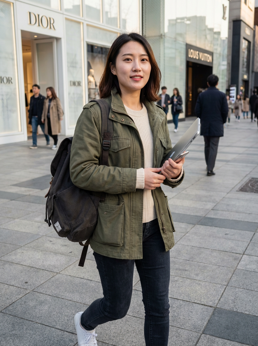 model as digital nomad in Seoul in Gangnam in Cheongdamdong Luxury Shopping street. stores visible in background, with backpack