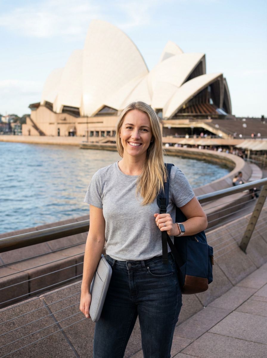 model as digital nomad in Sydney with the Sydney Opera House in the background, with backpack