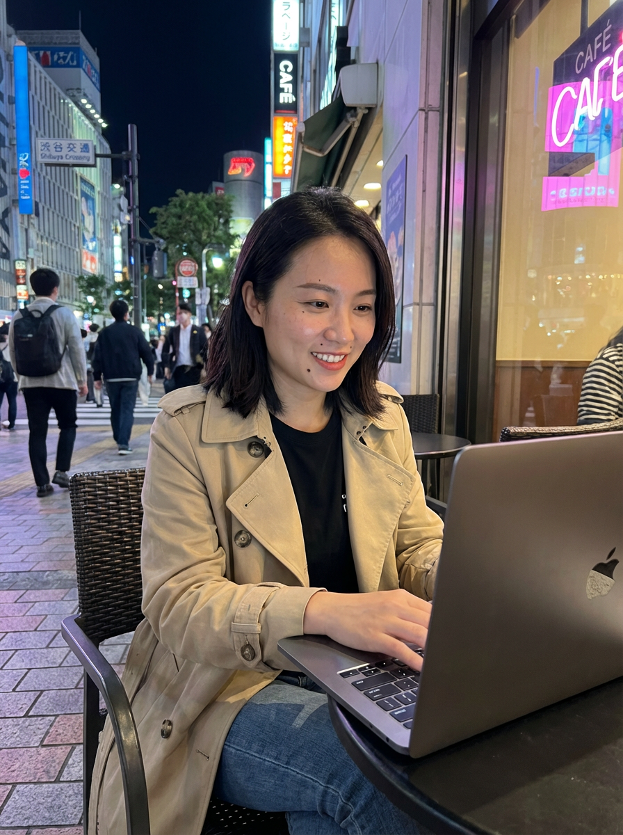 model as digital nomad in Tokyo at night with neon lights, working on laptop