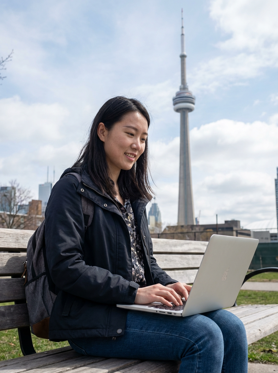 model as digital nomad in Toronto with the CN Tower in the background, working on laptop