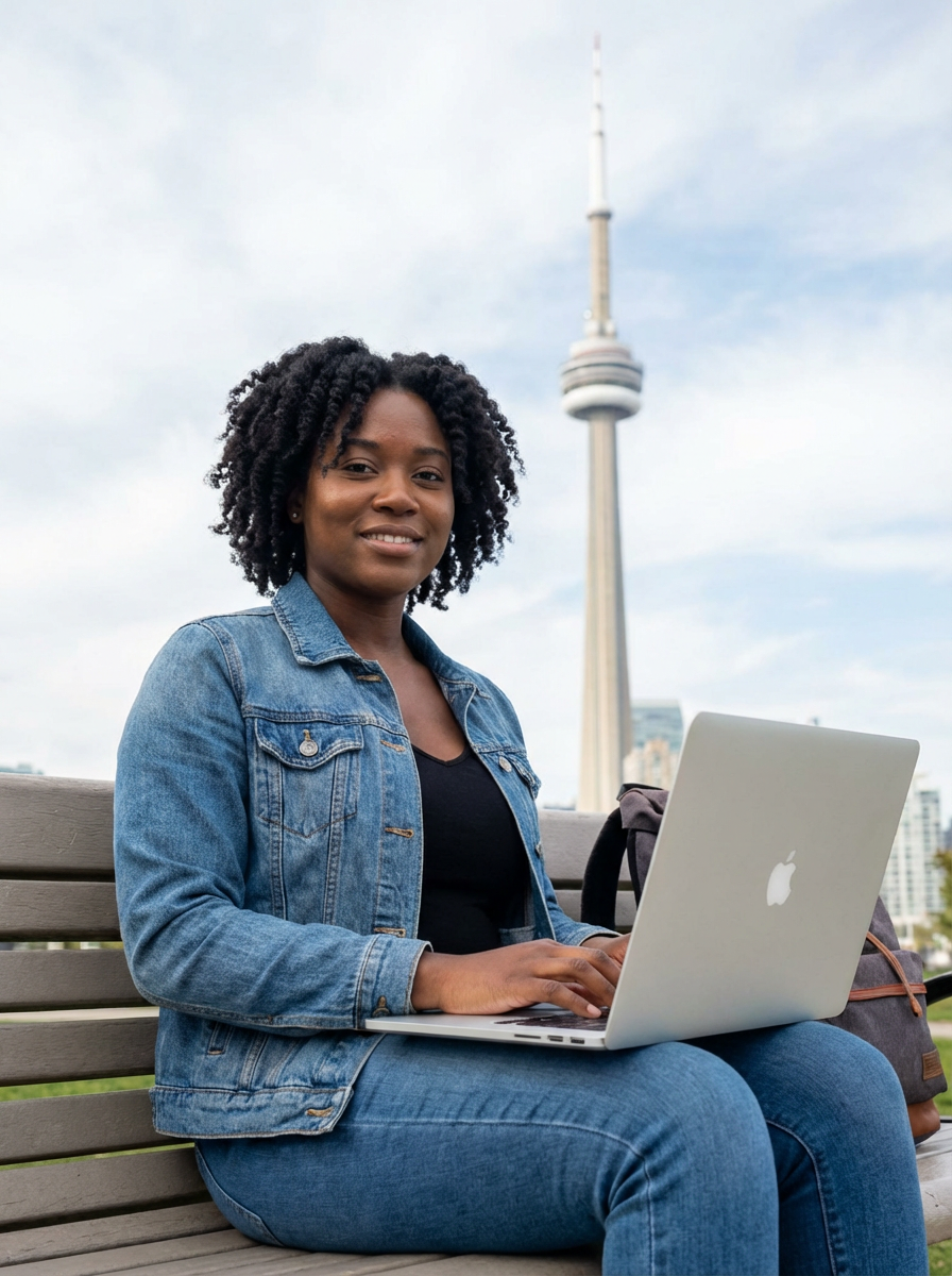 model as digital nomad in Toronto with the CN Tower in the background, working on laptop