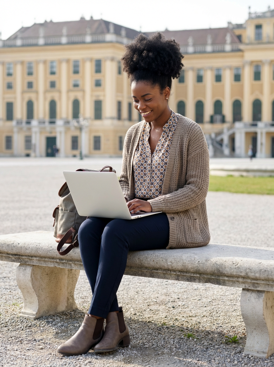 model as digital nomad in Vienna with the Schönbrunn Palace in the background, working on laptop