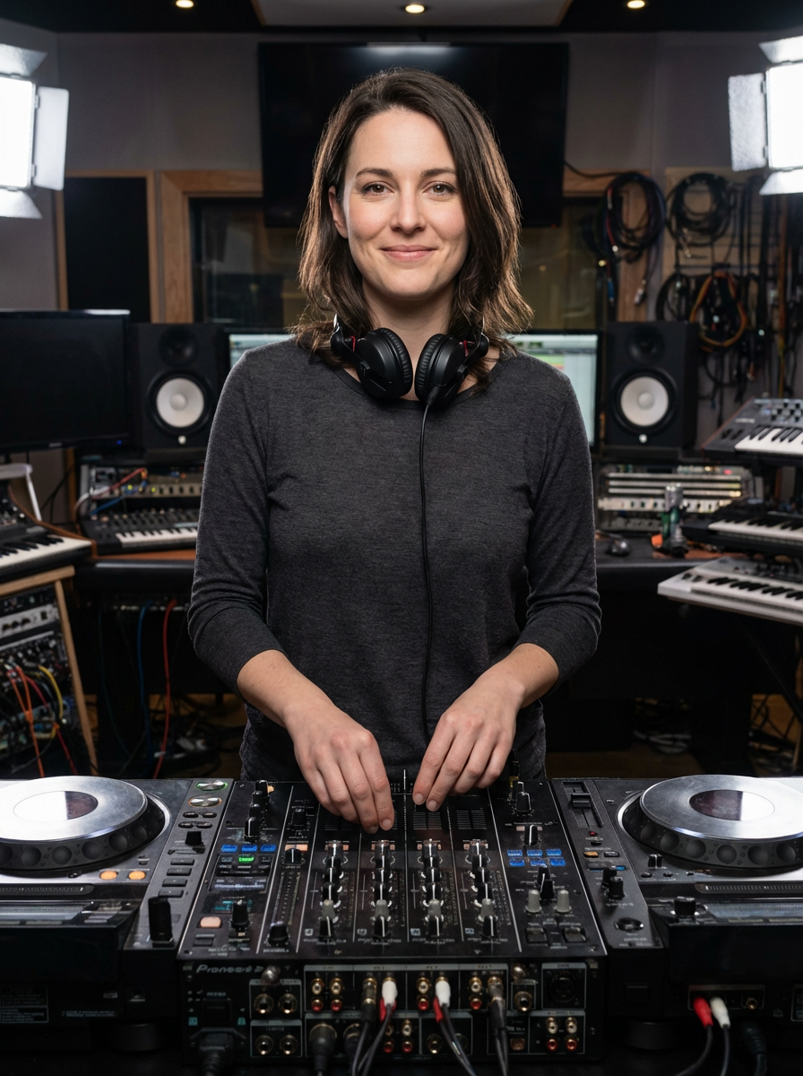 model as DJ producer, headphones around neck, electronic music aesthetic, studio equipment background