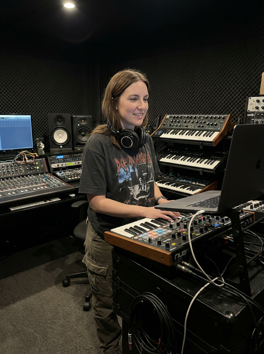 model as DJ producer, headphones around neck, electronic music aesthetic, studio equipment background