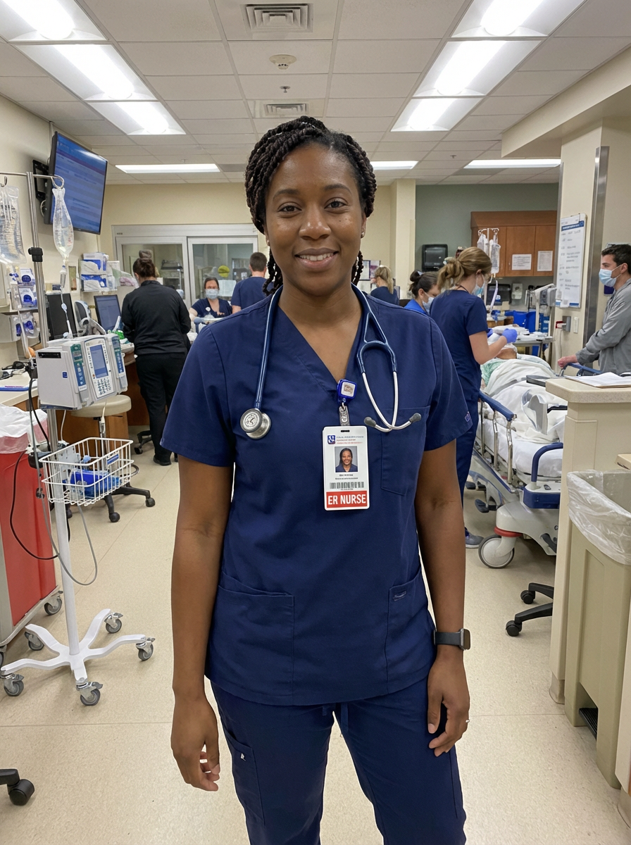 model as ER nurse, professional scrubs, calm confident expression, emergency department background