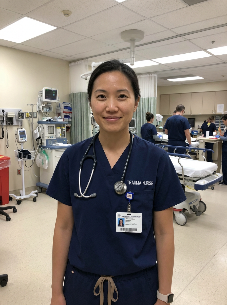 model as ER nurse, professional scrubs, calm confident expression, emergency department background