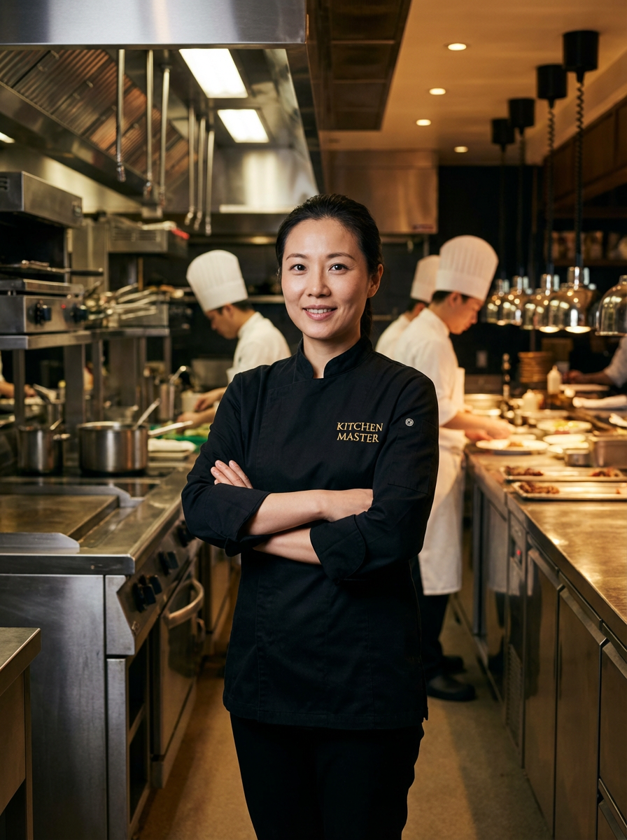 model as executive chef, black chef coat, arms crossed confident pose, upscale restaurant kitchen