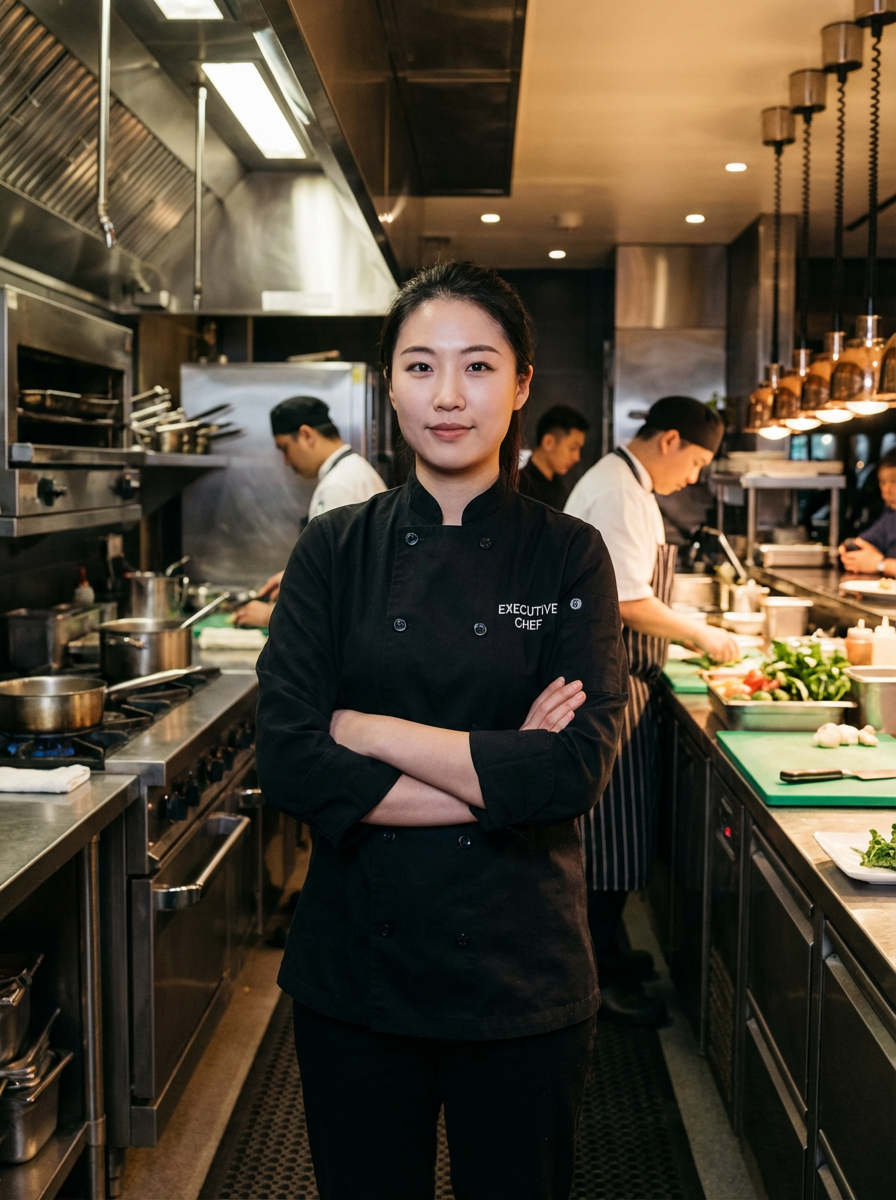model as executive chef, black chef coat, arms crossed confident pose, upscale restaurant kitchen