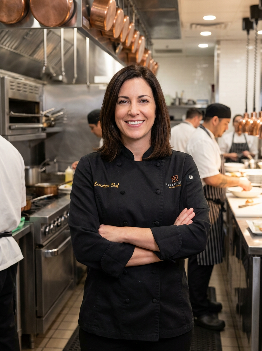 model as executive chef, black chef coat, arms crossed confident pose, upscale restaurant kitchen