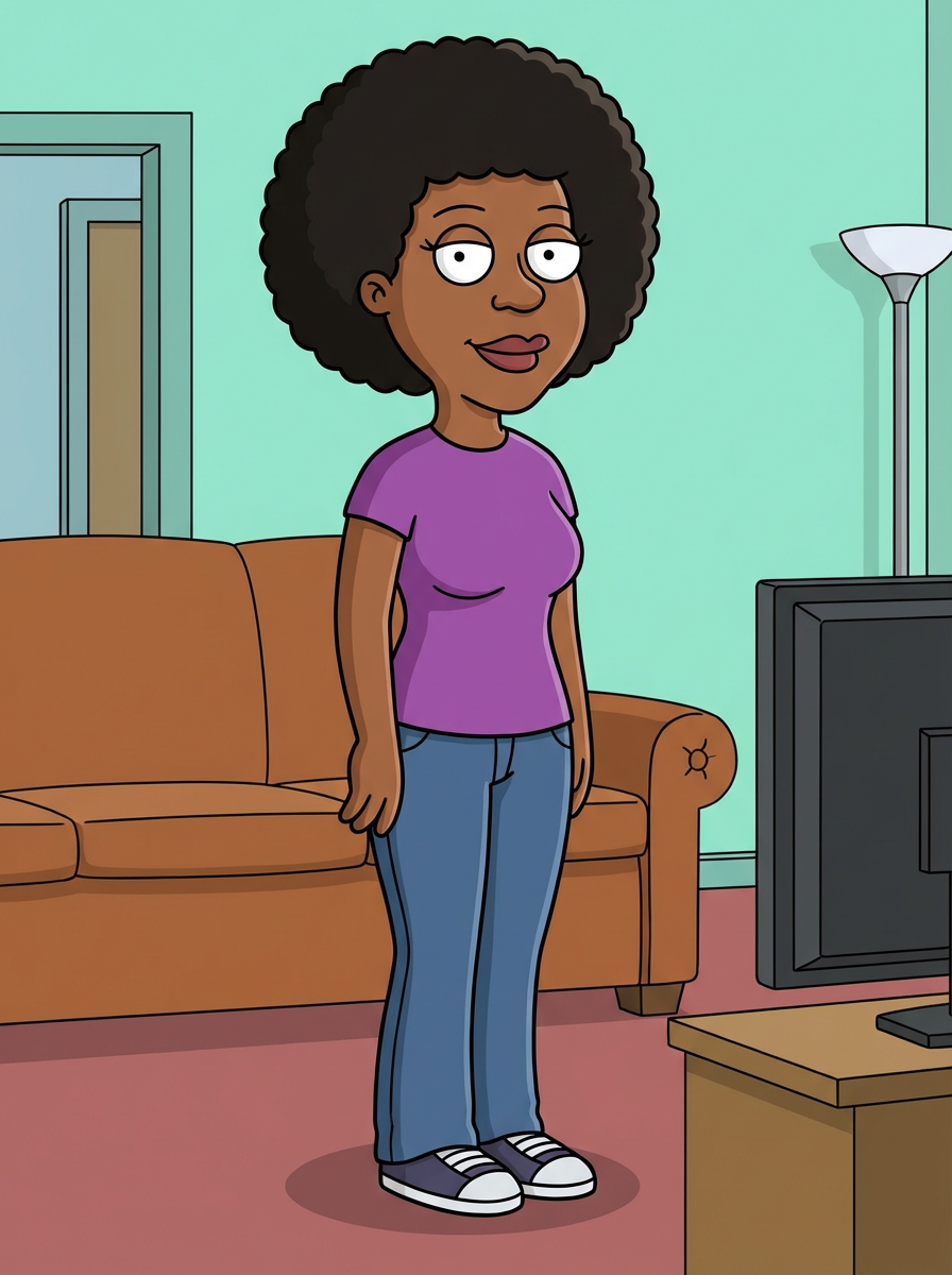 model as family guy style character, peter griffin universe aesthetic, cartoon sitcom look
