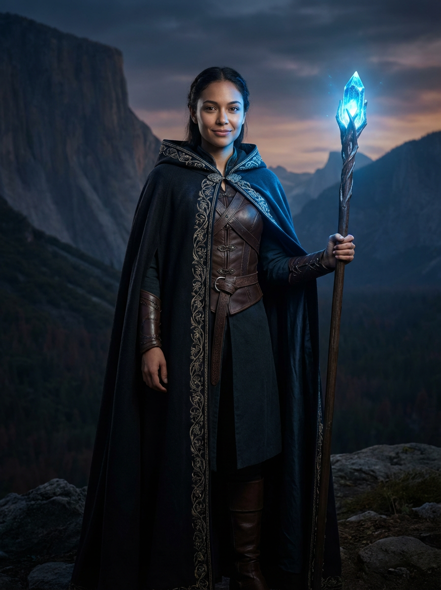 model as fantasy novel character, dramatic cape or cloak, magical lighting, epic landscape backdrop