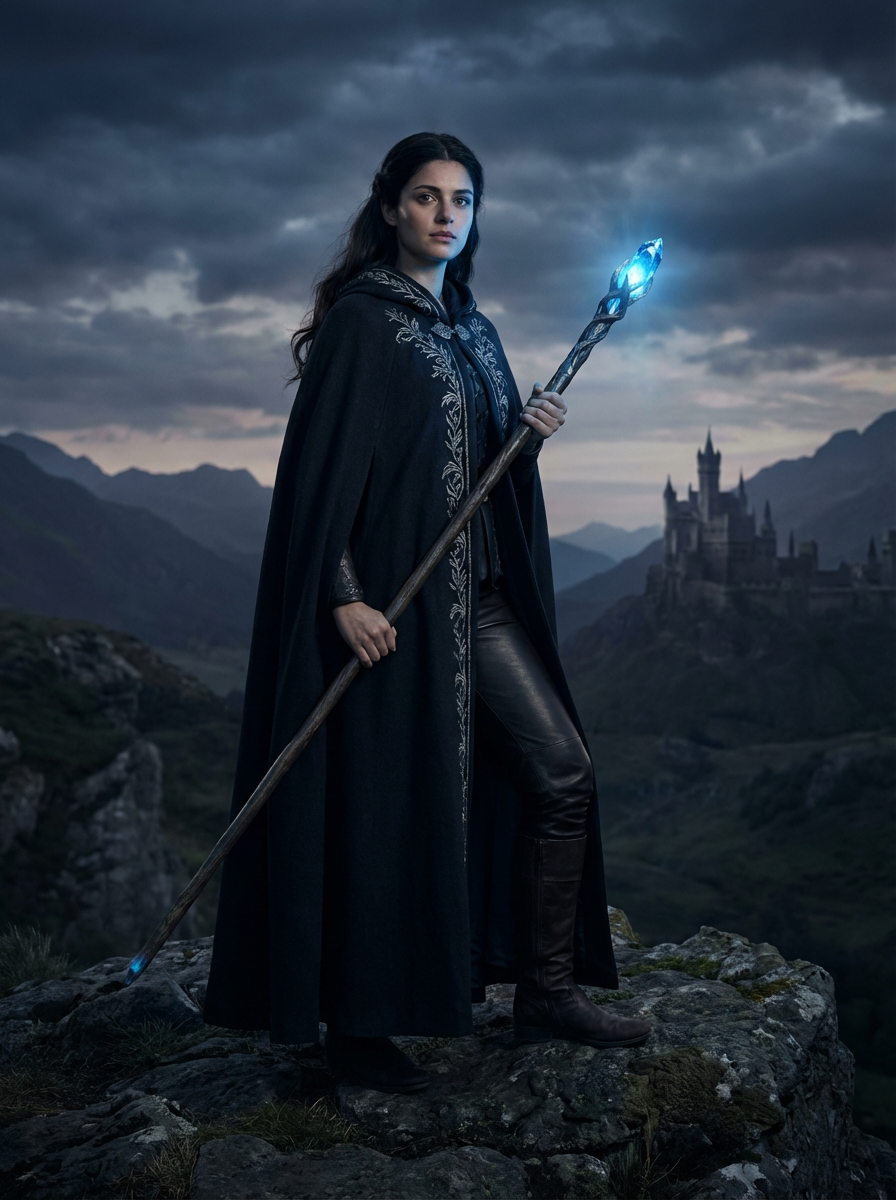 model as fantasy novel character, dramatic cape or cloak, magical lighting, epic landscape backdrop