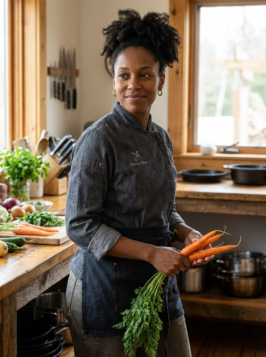 model as farm-to-table chef, casual chef coat, rustic kitchen background, fresh ingredients visible