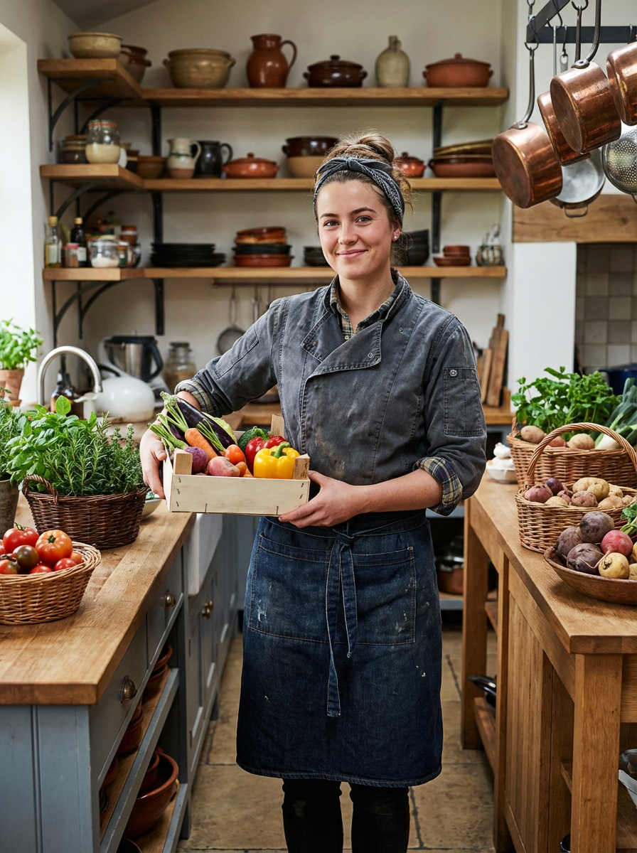 model as farm-to-table chef, casual chef coat, rustic kitchen background, fresh ingredients visible