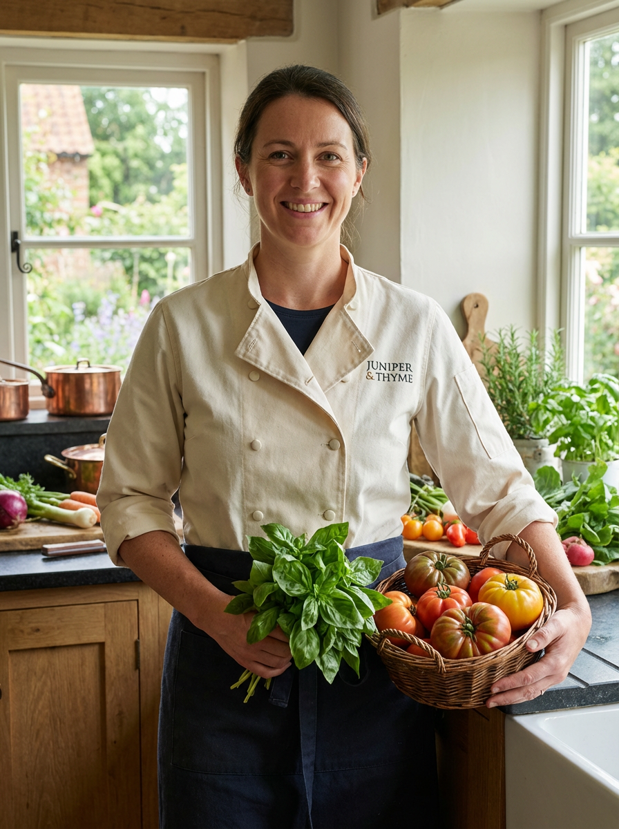 model as farm-to-table chef, casual chef coat, rustic kitchen background, fresh ingredients visible