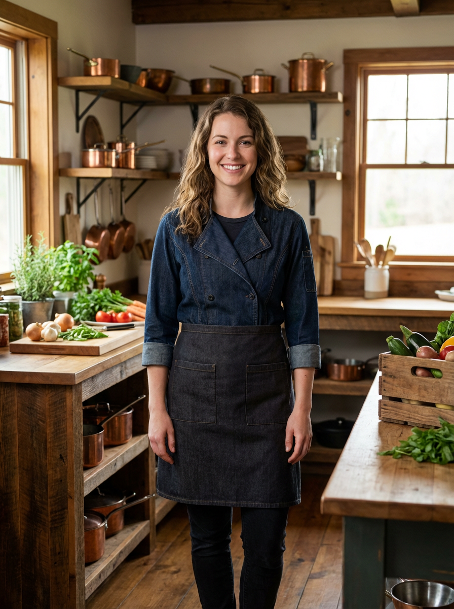 model as farm-to-table chef, casual chef coat, rustic kitchen background, fresh ingredients visible