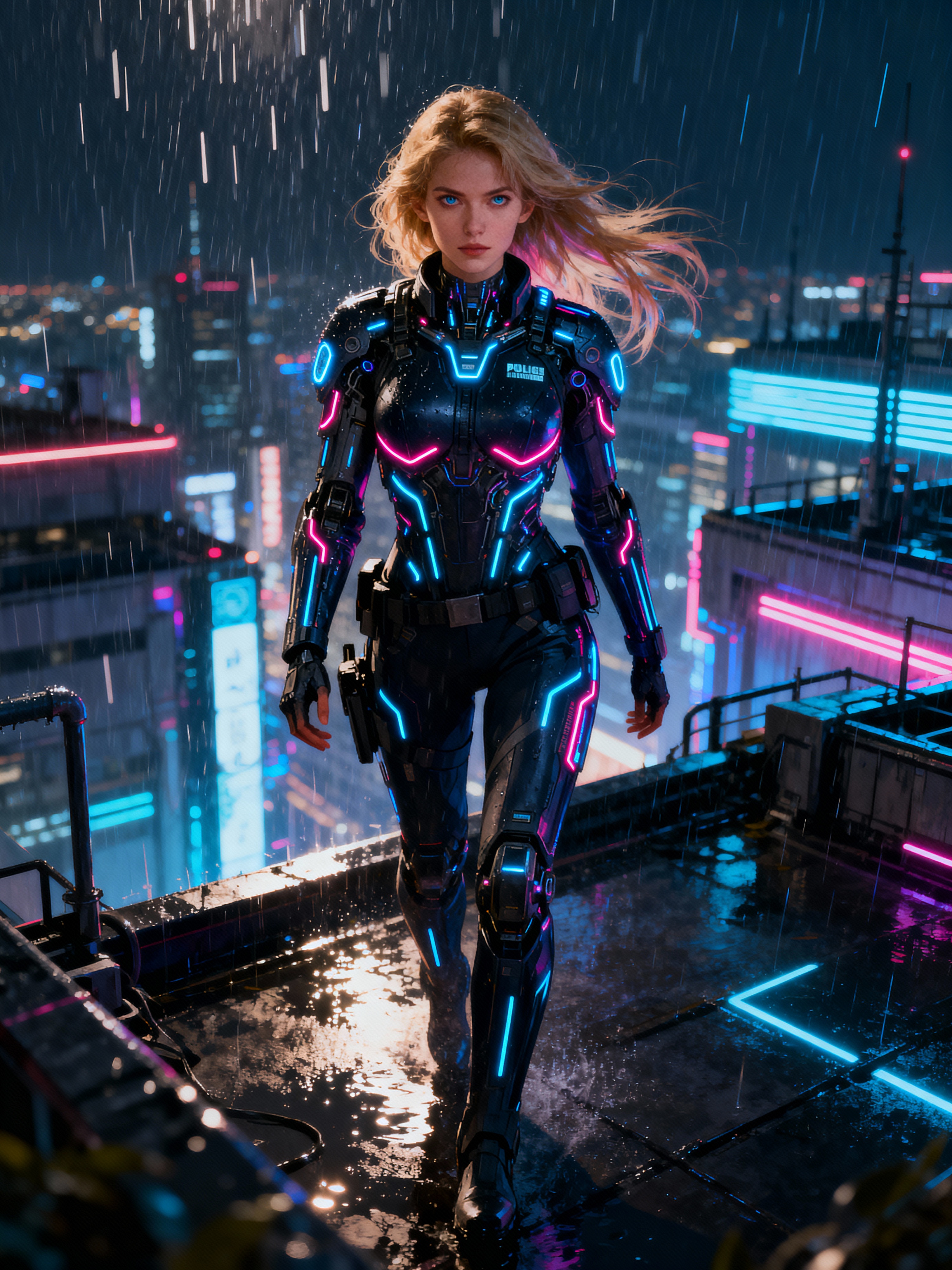 model as futuristic beautiful cyberpunk police officer, in heavy rainning futuristic tokyo rooftop cyberpunk night, ssci-fi, fantasy, intricate, very very beautiful, elegant, neon light, highly detailed, digital painting, artstation, concept art, soft light, hdri, smooth, sharp focus, illustration, art by tian zi and craig mullins and wlop and alphonse mucha