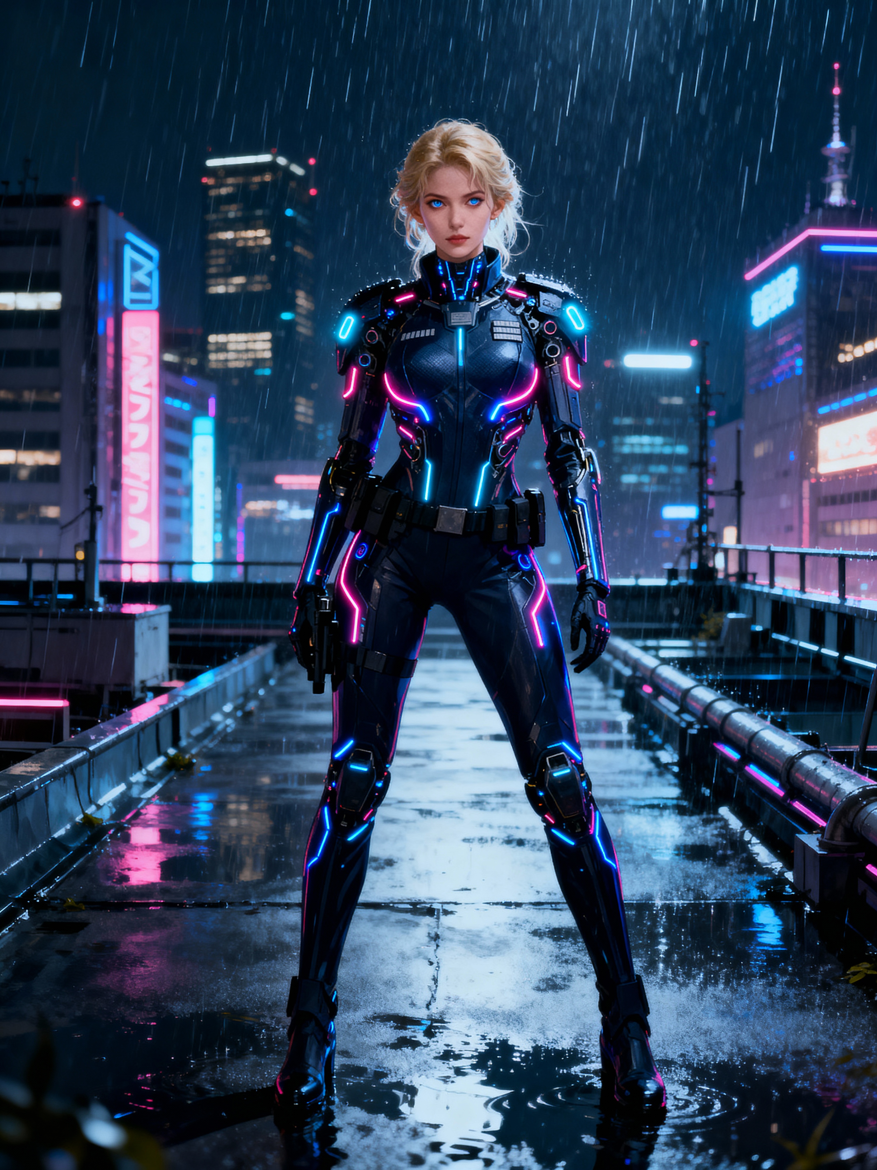 model as futuristic beautiful cyberpunk police officer, in heavy rainning futuristic tokyo rooftop cyberpunk night, ssci-fi, fantasy, intricate, very very beautiful, elegant, neon light, highly detailed, digital painting, artstation, concept art, soft light, hdri, smooth, sharp focus, illustration, art by tian zi and craig mullins and wlop and alphonse mucha
