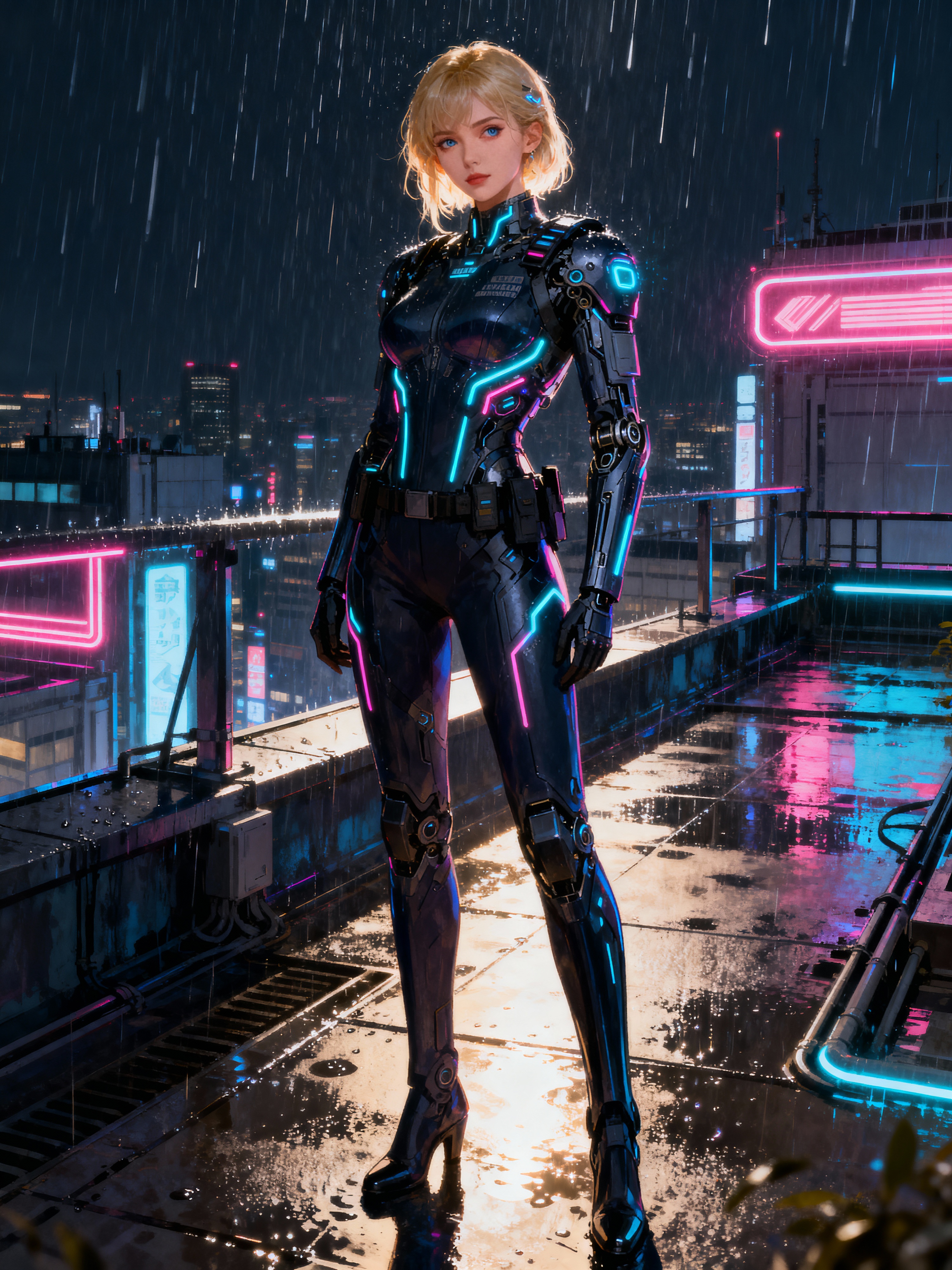 model as futuristic beautiful cyberpunk police officer, in heavy rainning futuristic tokyo rooftop cyberpunk night, ssci-fi, fantasy, intricate, very very beautiful, elegant, neon light, highly detailed, digital painting, artstation, concept art, soft light, hdri, smooth, sharp focus, illustration, art by tian zi and craig mullins and wlop and alphonse mucha