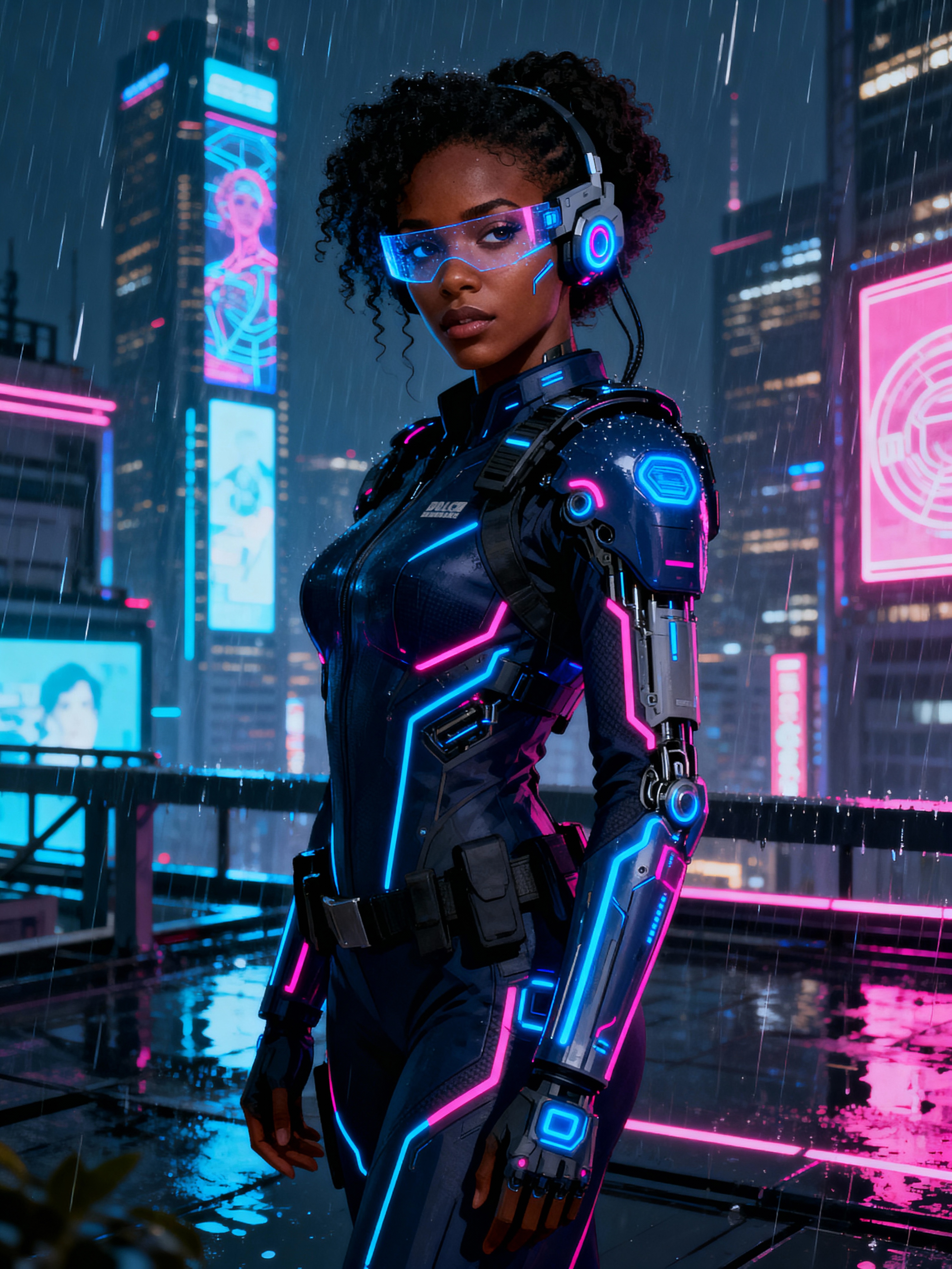 model as futuristic beautiful cyberpunk police officer, in heavy rainning futuristic tokyo rooftop cyberpunk night, ssci-fi, fantasy, intricate, very very beautiful, elegant, neon light, highly detailed, digital painting, artstation, concept art, soft light, hdri, smooth, sharp focus, illustration, art by tian zi and craig mullins and wlop and alphonse mucha