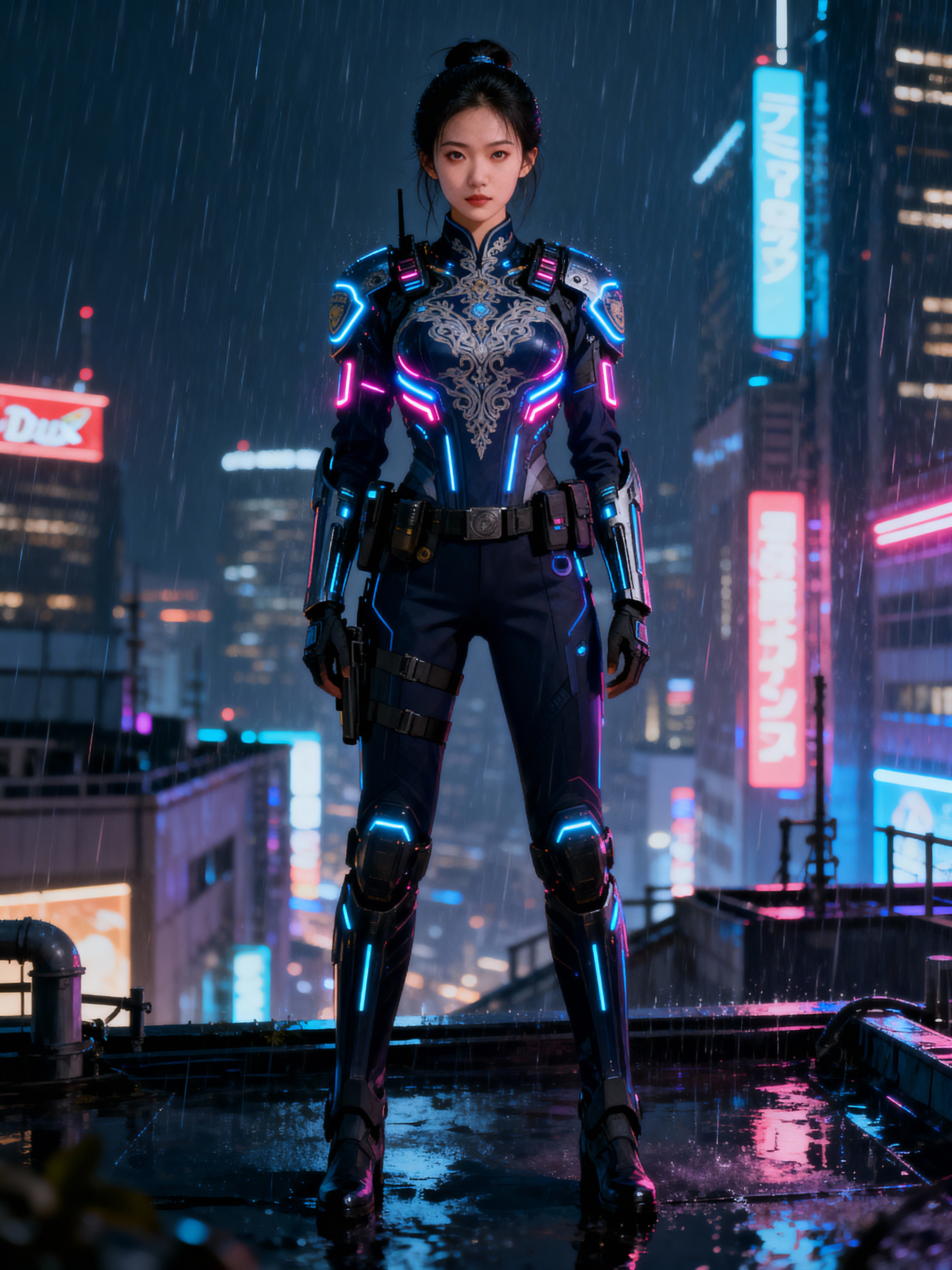 model as futuristic beautiful cyberpunk police officer, in heavy rainning futuristic tokyo rooftop cyberpunk night, ssci-fi, fantasy, intricate, very very beautiful, elegant, neon light, highly detailed, digital painting, artstation, concept art, soft light, hdri, smooth, sharp focus, illustration, art by tian zi and craig mullins and wlop and alphonse mucha