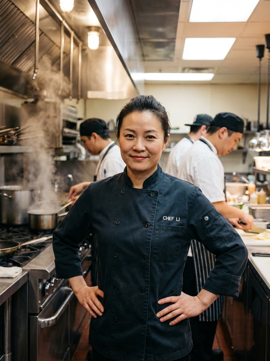 model as head chef, professional double-breasted chef coat, commanding presence, busy kitchen background