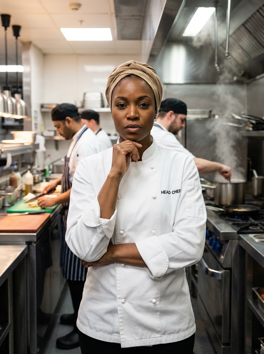 model as head chef, professional double-breasted chef coat, commanding presence, busy kitchen background