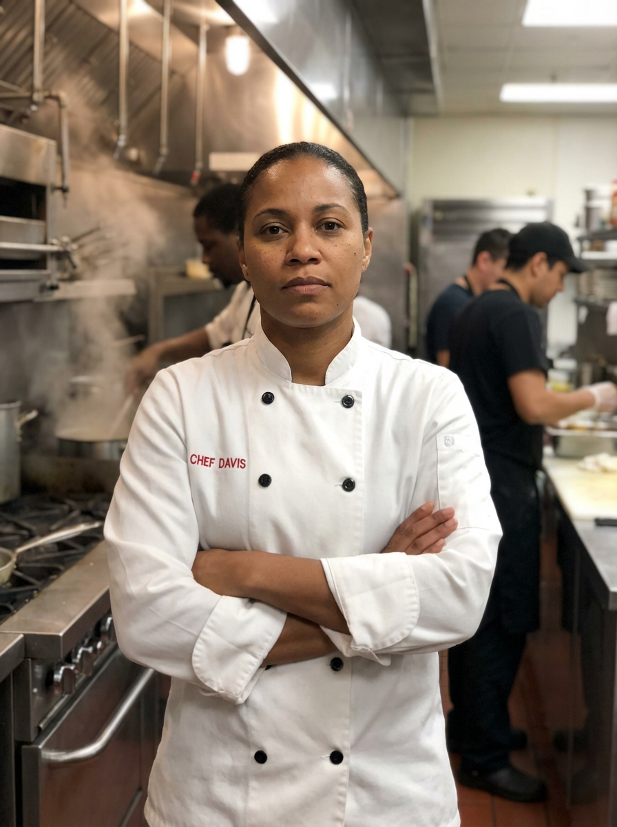 model as head chef, professional double-breasted chef coat, commanding presence, busy kitchen background