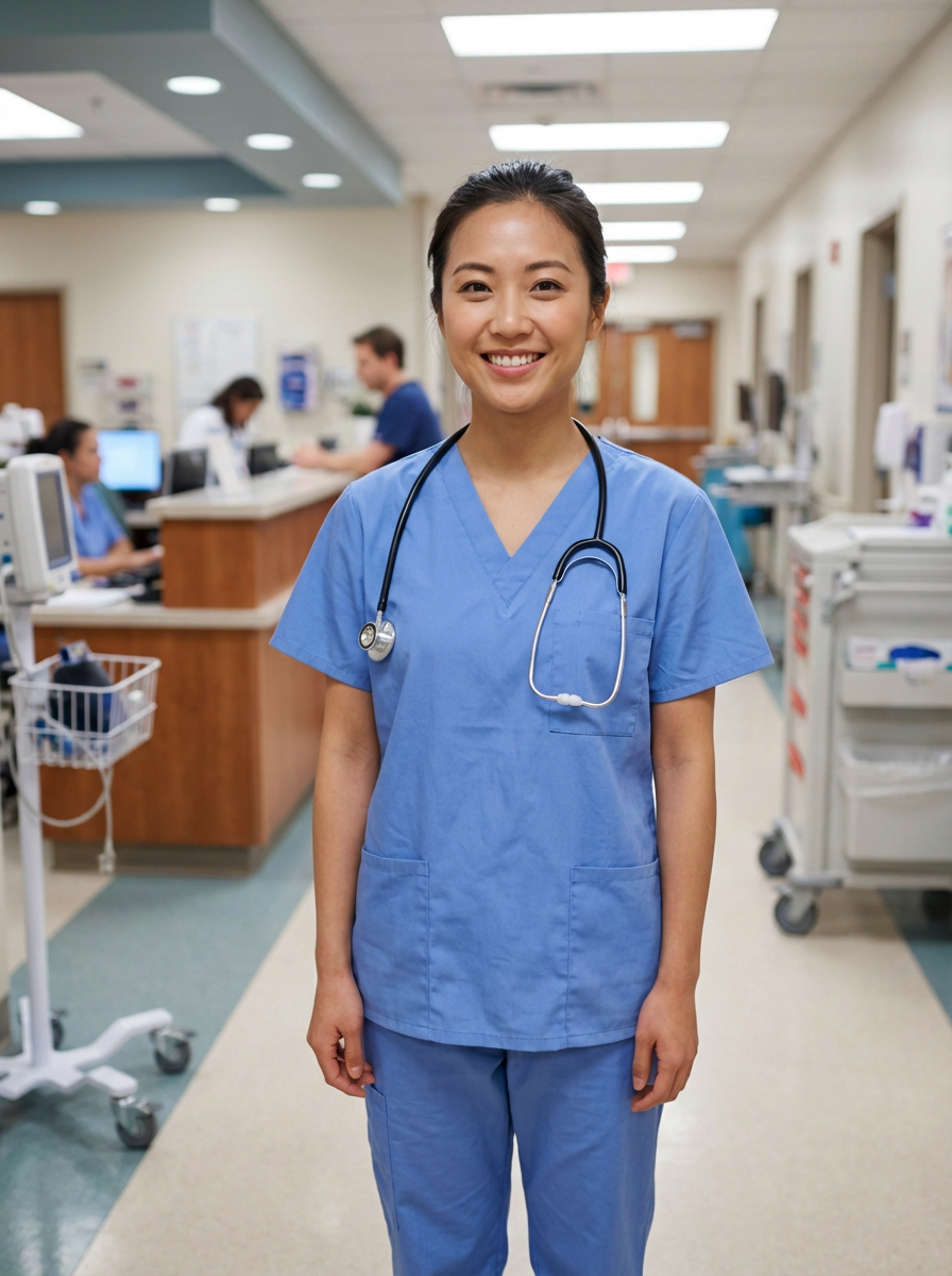 model as healthcare professional, neat scrubs in ceil blue , warm genuine smile, clinical setting