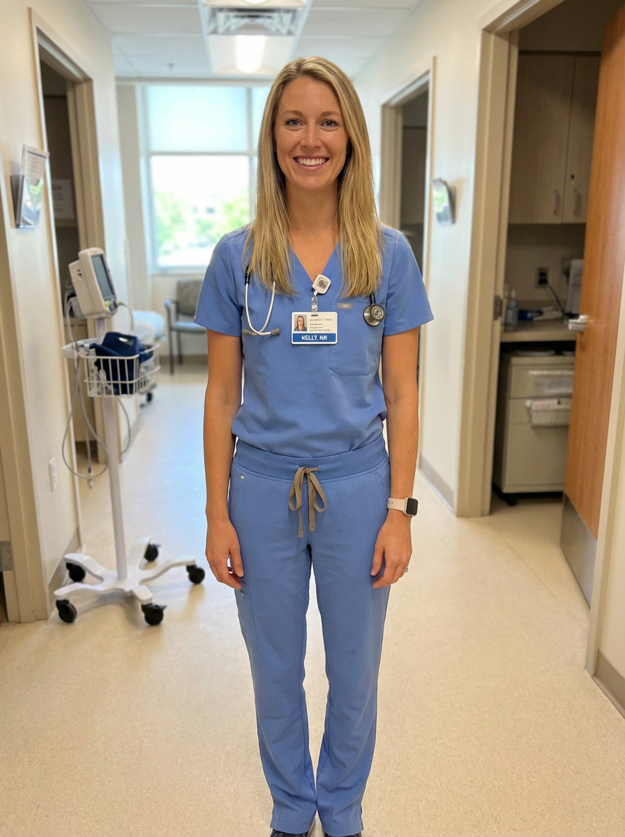 model as healthcare professional, neat scrubs in ceil blue , warm genuine smile, clinical setting