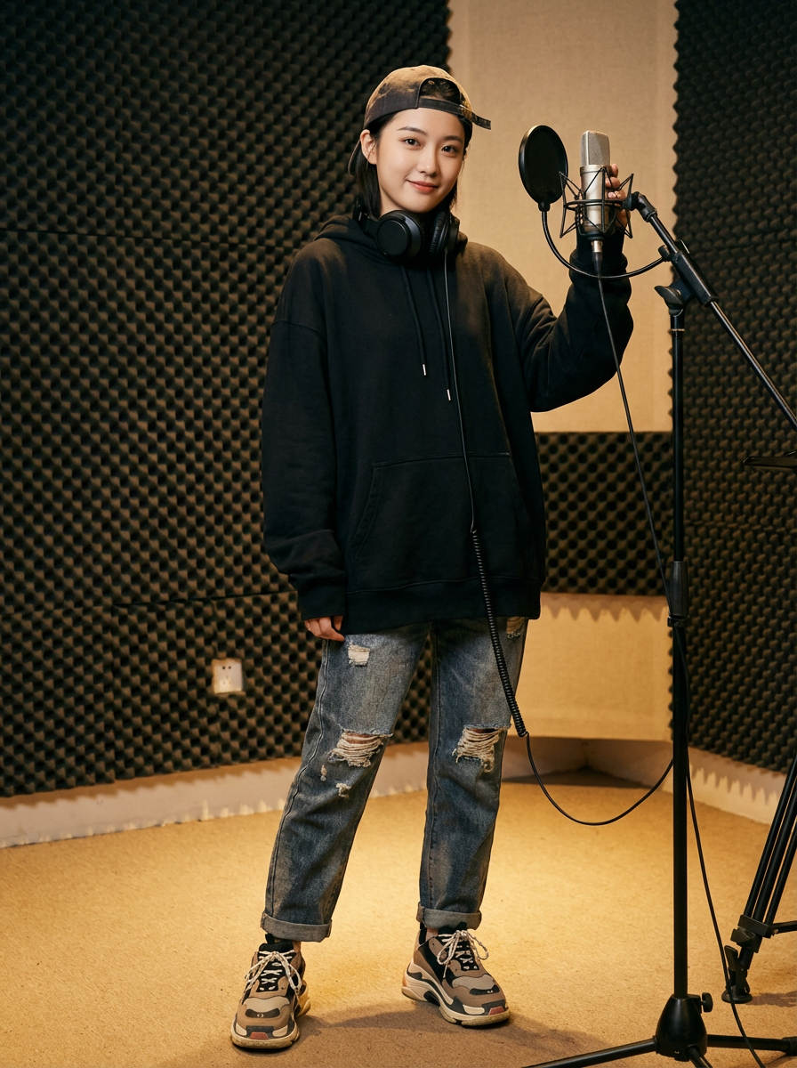 model as hip hop artist, urban stylish attire, confident swagger, studio booth background