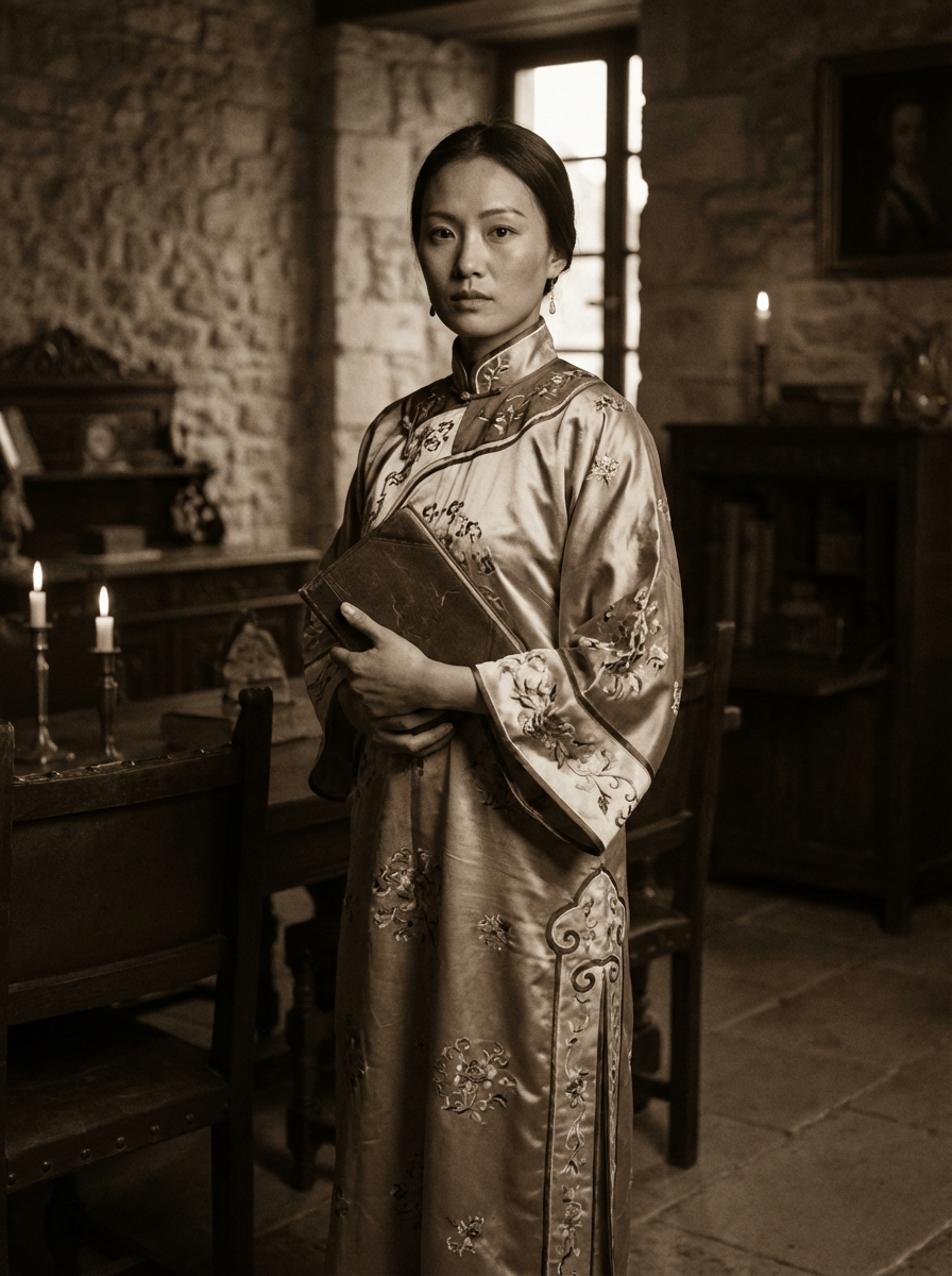 model as historical fiction character, period-appropriate styling, vintage aesthetic, dramatic composition