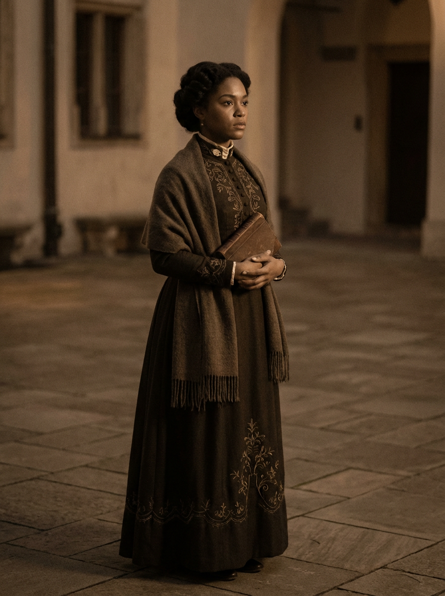 model as historical fiction character, period-appropriate styling, vintage aesthetic, dramatic composition