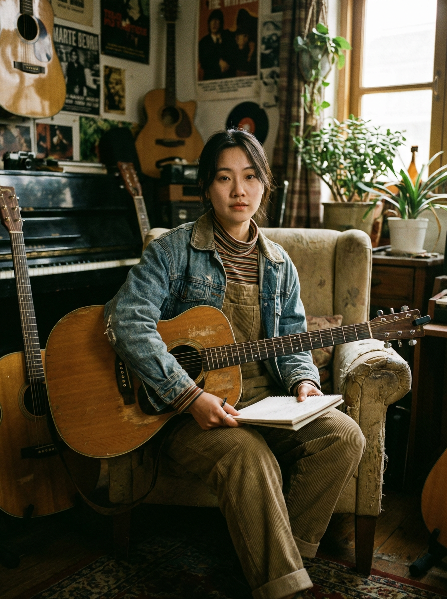 model as indie artist, authentic raw aesthetic, vintage styling, lo-fi artistic composition