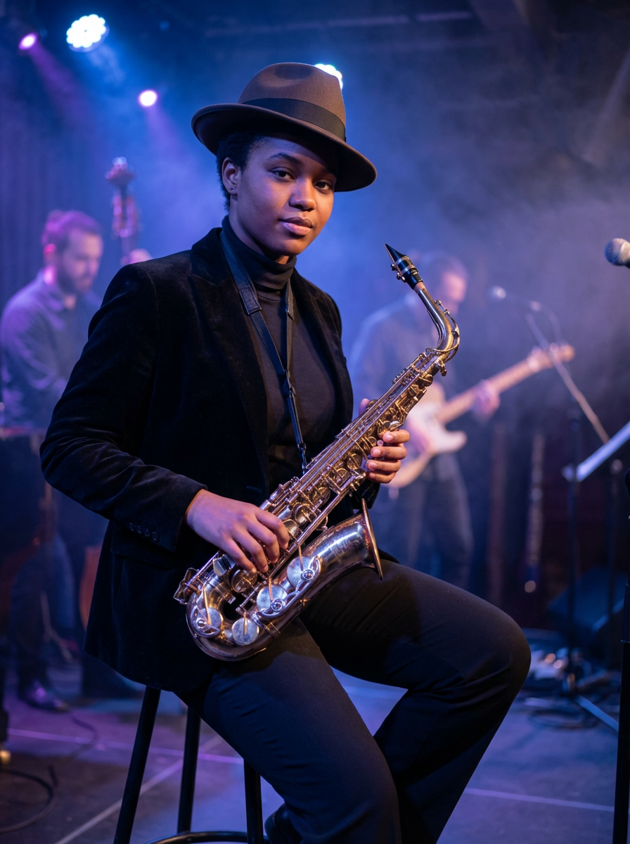 model as jazz musician, sophisticated cool aesthetic, smoky club atmosphere, blue mood lighting