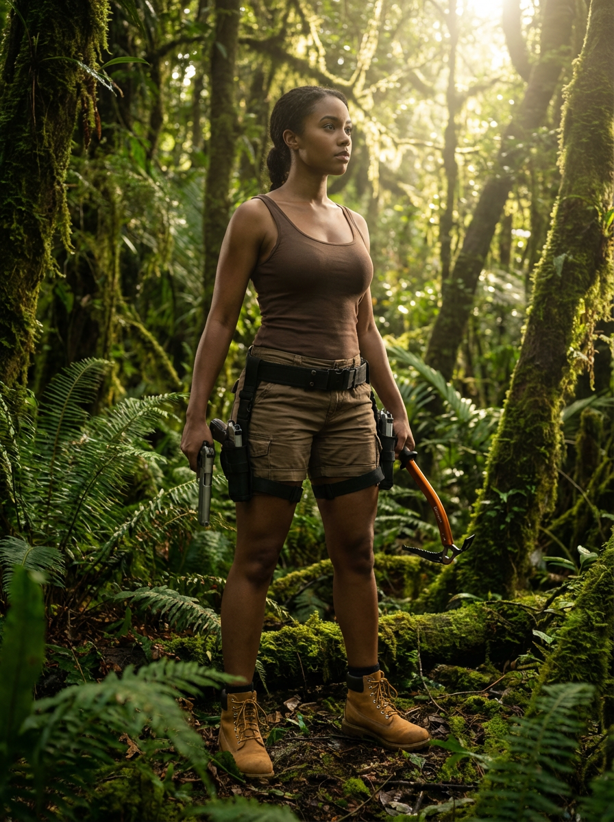 model as Lara Croft in Tombraider, in rainforest, cinematic lighting