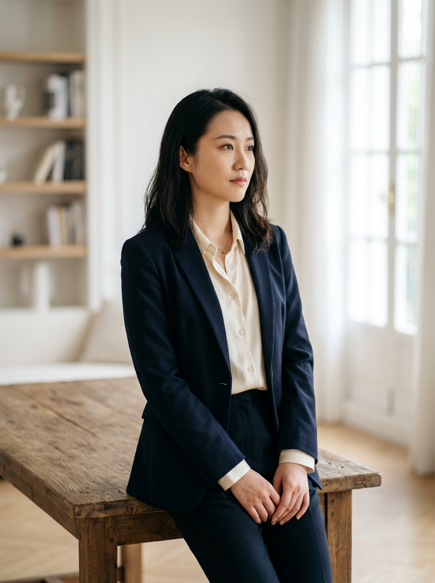model as memoir author photo, thoughtful expression, professional yet personal, elegant simple background