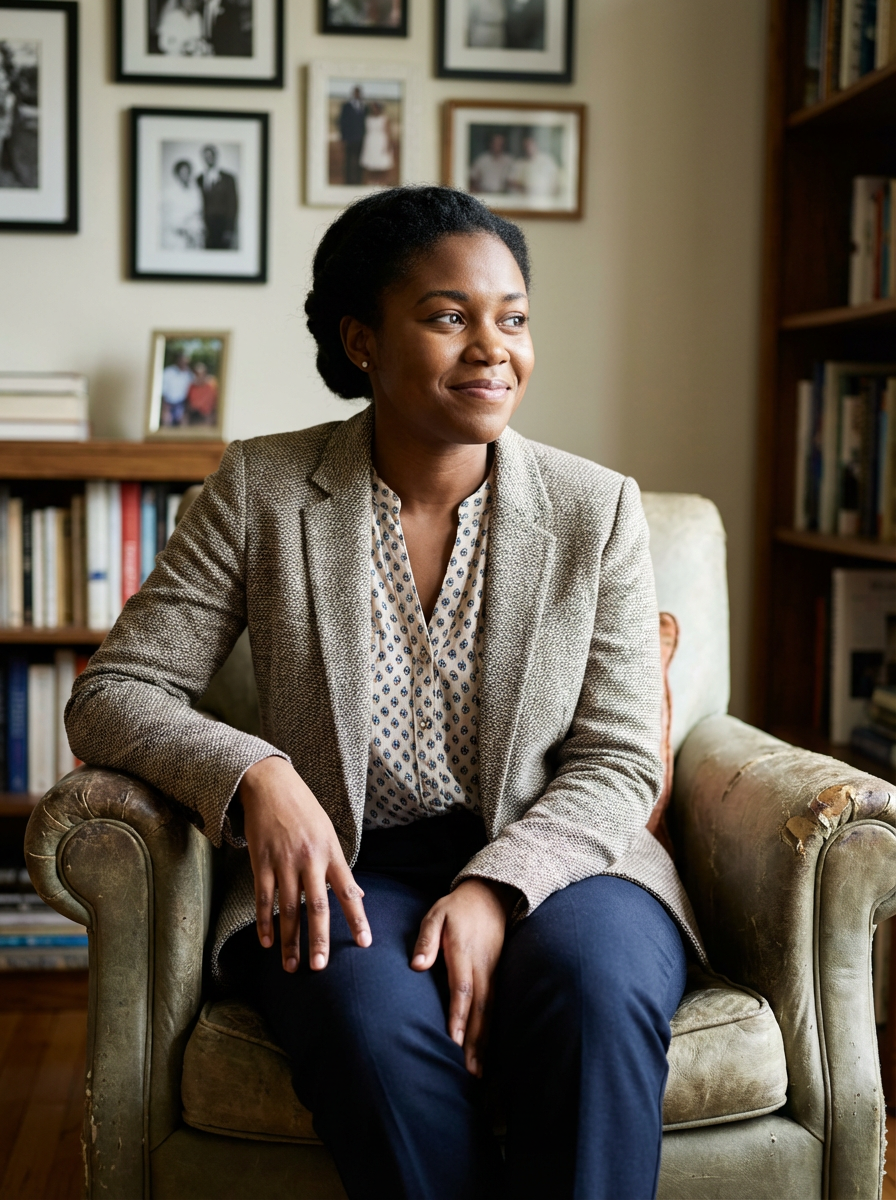 model as memoir author photo, thoughtful expression, professional yet personal, elegant simple background