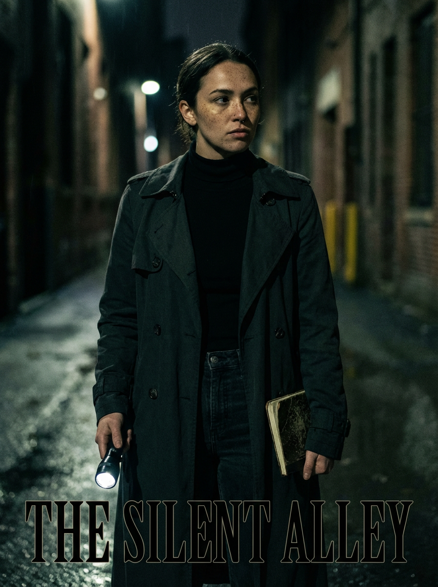 model as mystery novel cover, detective noir aesthetic, shadowy lighting, intriguing expression