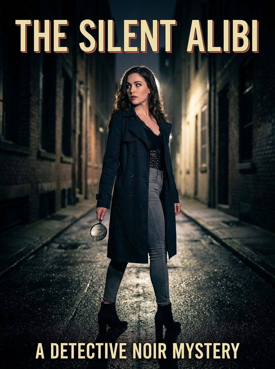 model as mystery novel cover, detective noir aesthetic, shadowy lighting, intriguing expression