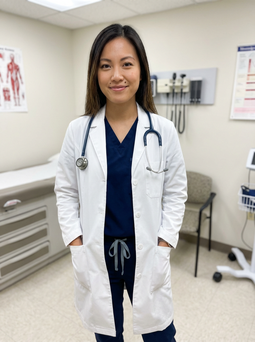 model as nurse in white lab coat over scrubs, stethoscope around neck, confident caring expression, medical office background