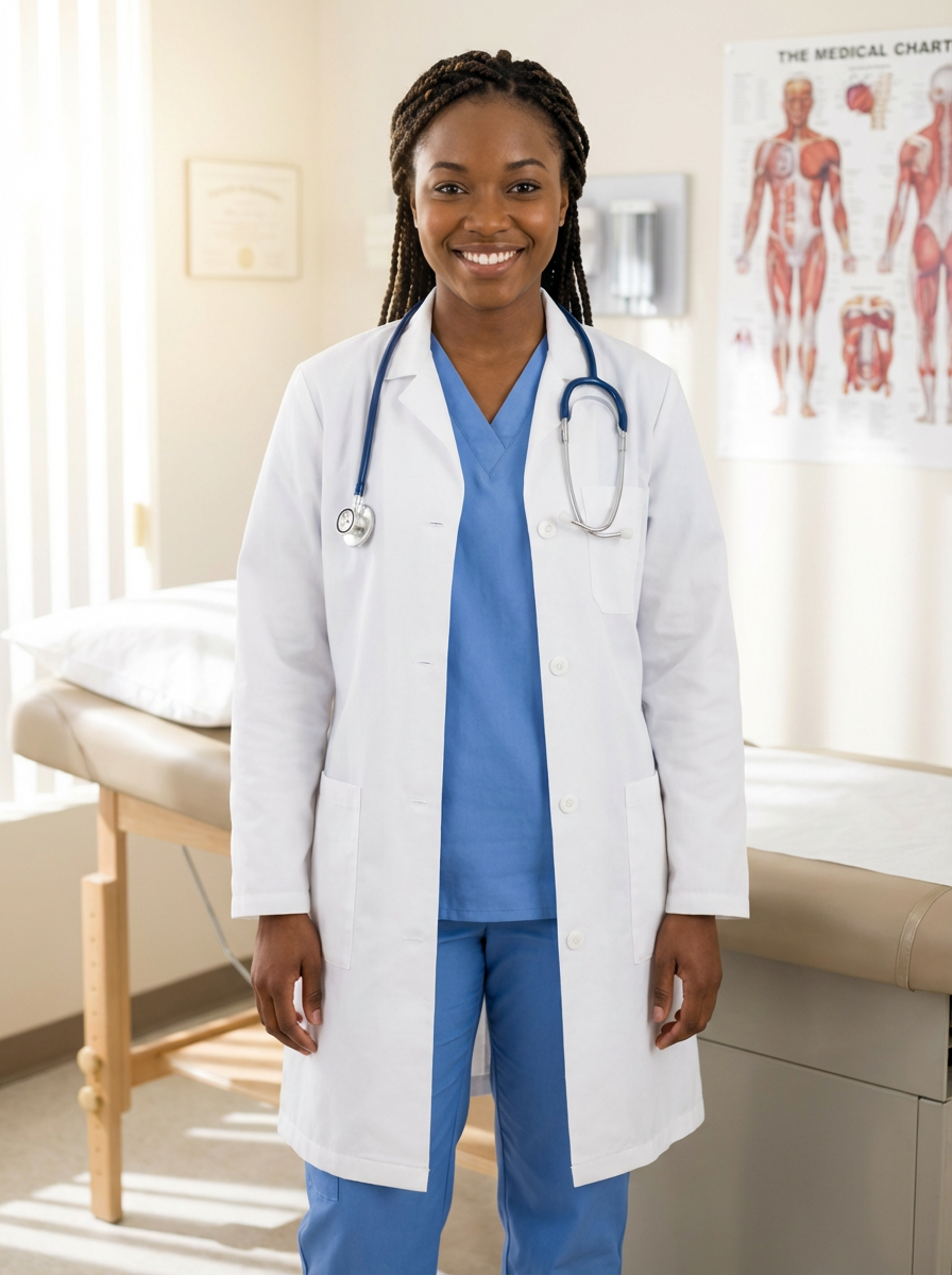 model as nurse in white lab coat over scrubs, stethoscope around neck, confident caring expression, medical office background