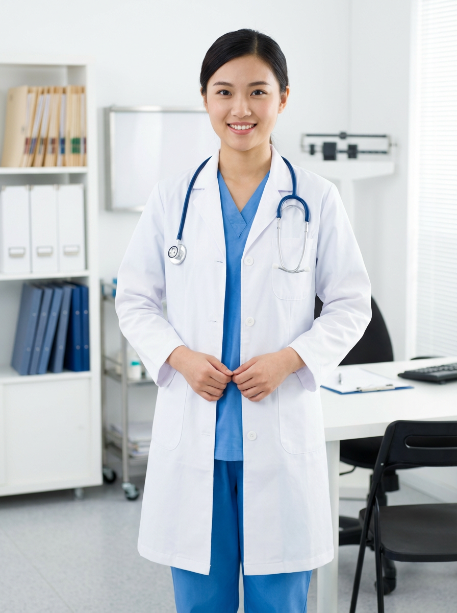 model as nurse in white lab coat over scrubs, stethoscope around neck, confident caring expression, medical office background