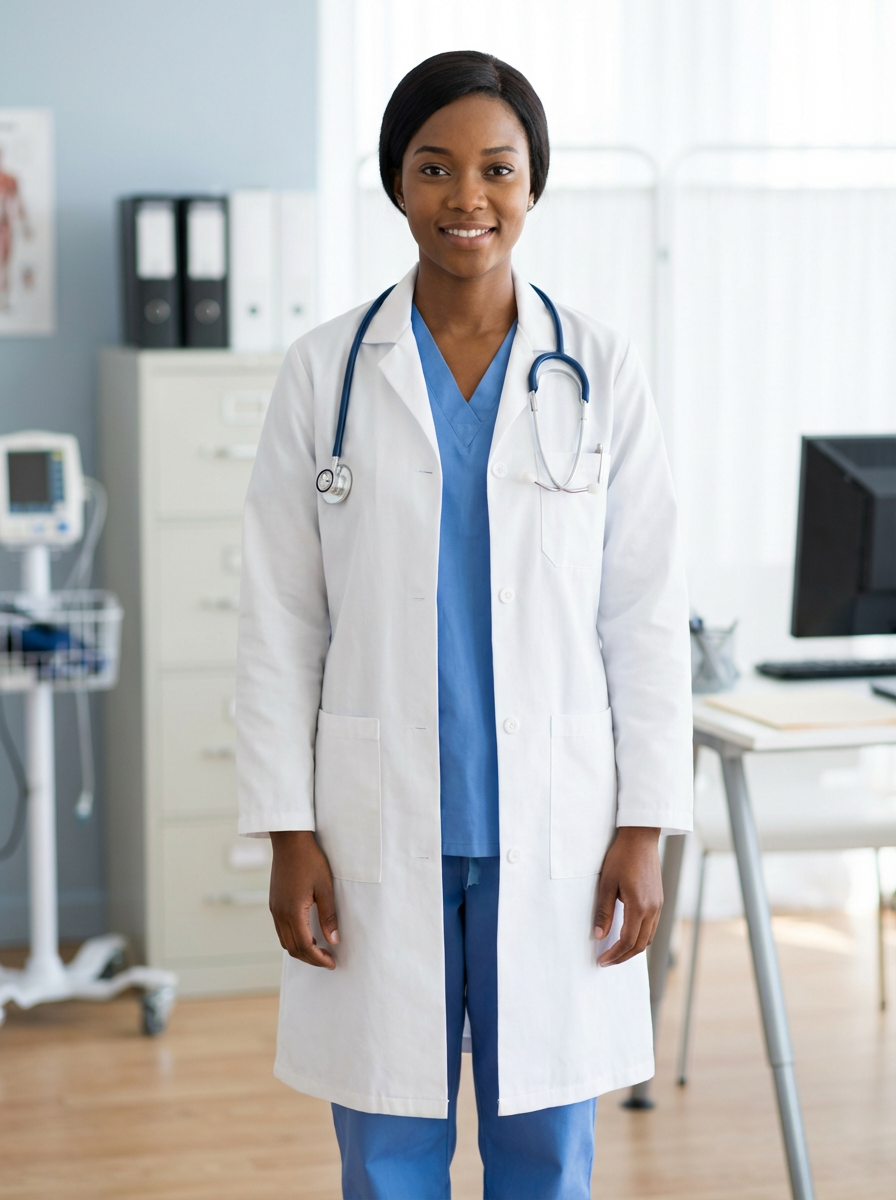 model as nurse in white lab coat over scrubs, stethoscope around neck, confident caring expression, medical office background
