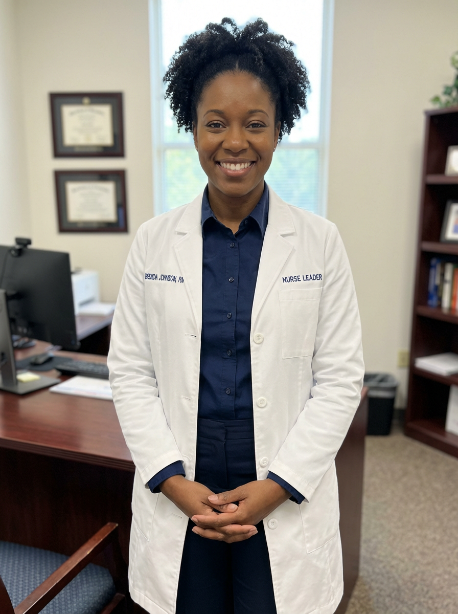 model as nurse leader, business casual with lab coat, authoritative yet approachable, office setting