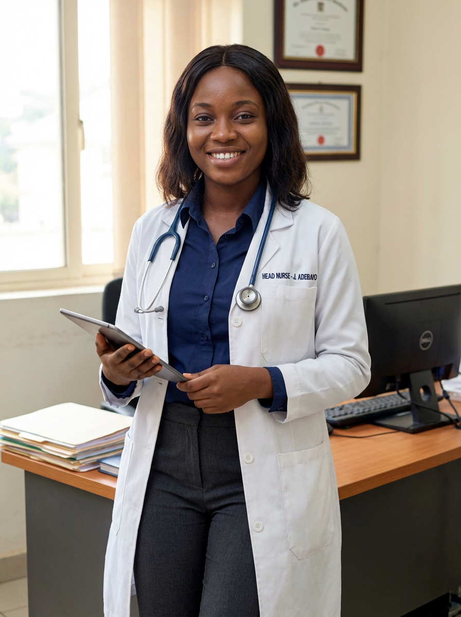 model as nurse leader, business casual with lab coat, authoritative yet approachable, office setting