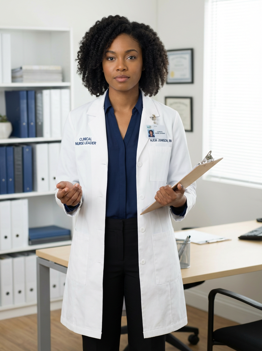 model as nurse leader, business casual with lab coat, authoritative yet approachable, office setting