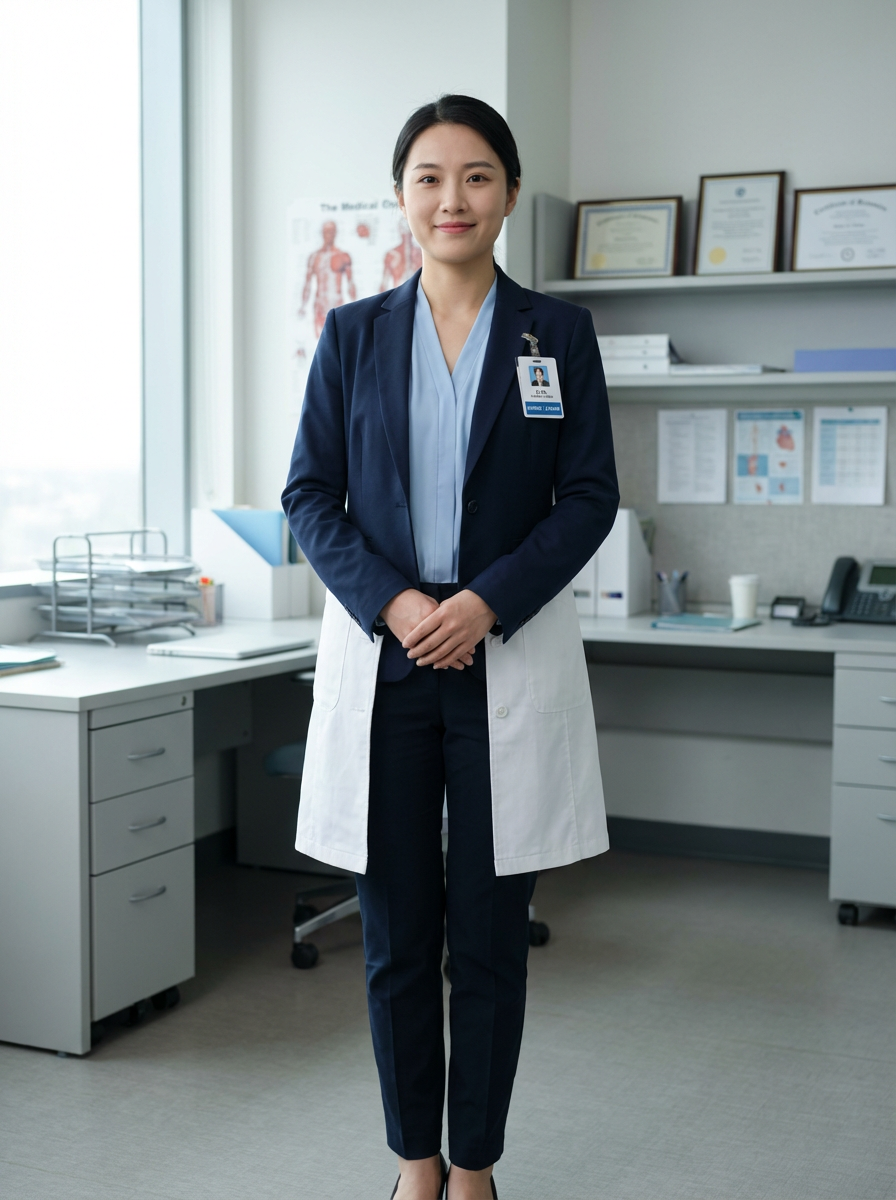 model as nurse leader, business casual with lab coat, authoritative yet approachable, office setting