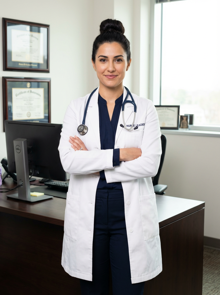 model as nurse leader, business casual with lab coat, authoritative yet approachable, office setting