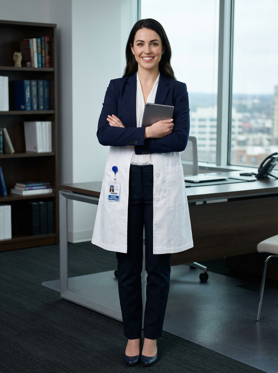 model as nurse leader, business casual with lab coat, authoritative yet approachable, office setting